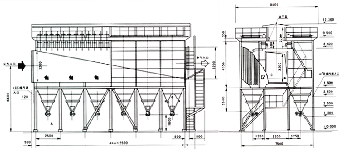 該除塵器采用逐行噴吹的方式,可通過噴吹管上開孔孔徑的變化,合理調(diào)節(jié)壓縮空氣噴吹到袋底的壓力,使其既能清灰徹底,又不損傷除塵布袋