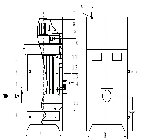 含塵氣體進(jìn)入箱體,由扁布袋過濾器進(jìn)行過濾,粉塵被阻留在除塵布袋外表面,已凈化的氣體通過濾袋進(jìn)入風(fēng)機(jī),由風(fēng)機(jī)吸入直接排入室內(nèi)(也可接管排至室外)。