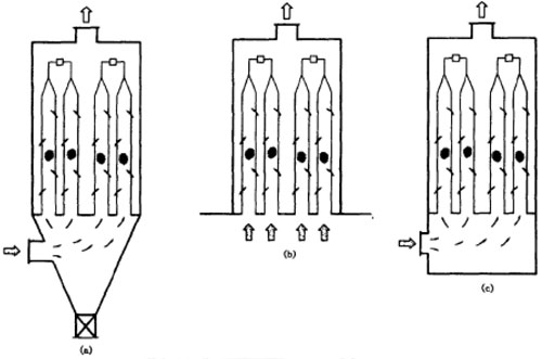 UF系列單機袋式除塵器的結(jié)構(gòu)如圖7-1所示,主要由風(fēng)機、搖動機械、袋室和濾袋等部件組成。分三種組裝形式:底部帶灰斗型、底部敞開型和底部帶灰箱型(分別見圖7-2a、b、c)。有2號~7號六個單機規(guī)格和各種單機組成,不論組裝形式和規(guī)格大小,其圖7-1部分的結(jié)構(gòu)組成和原理都是相同的。