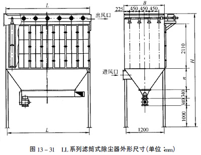 LL系列濾芯除塵器主要外形尺寸及安裝尺寸見(jiàn)圖13—31和表13—22。