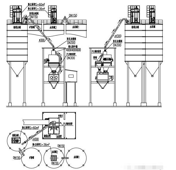 3、所有筒倉(cāng)的排氣管路都引到地面除塵器里,所以兩倉(cāng)或三倉(cāng)共用一個(gè)除塵器時(shí)不存在串料問(wèn)題。