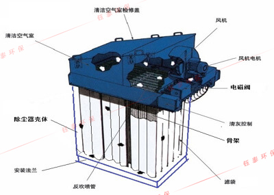 含塵空氣由風(fēng)口進(jìn)入除塵器箱體內(nèi),細(xì)小塵粒由于濾袋的多種效應(yīng)作用,被滯阻在濾袋外壁。凈化后的氣體通過濾袋從上箱體出風(fēng)口排出。隨著使用時(shí)間的增長,濾袋表面吸附的粉塵增多,濾袋的透氣性減弱,使除塵器阻力不斷增大。為保證除塵器的阻力控制在限定的范圍之內(nèi),由脈沖控制儀發(fā)出信號(hào),循序打開電磁脈沖閥,使氣包內(nèi)的壓縮空氣由噴吹管各噴射到對(duì)應(yīng)的骨架(稱為一次風(fēng)),并在高速氣流通過骨架時(shí)誘導(dǎo)數(shù)倍于一次風(fēng)的周圍空氣(稱為二次風(fēng))進(jìn)入濾袋,造成濾袋瞬間急劇膨脹,由于反向脈沖氣流的沖擊作用很快消失,濾袋又急劇收縮,這樣使積附在濾袋外壁上的粉塵被清除。由于清灰是依次分別向幾組濾袋進(jìn)行,并不切斷需要處理的含塵空氣,所以在清灰過程中,除塵器的處理能力保持不變。