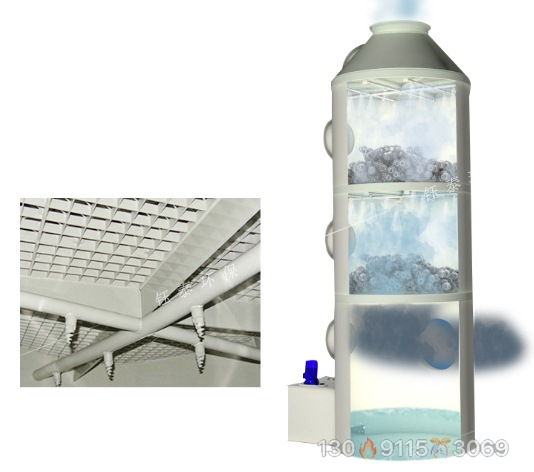 廢氣由風(fēng)機(jī)從風(fēng)道吸入,并從下至上穿過填料層。循環(huán)吸收器通過高效噴嘴由頂部噴嘴均勻地噴入填料層,并沿填料層表面向下流動(dòng),進(jìn)入循環(huán)水箱。由于填料中吸收劑的上升和下降恒定接觸,在上升的氣液濃度越來越低,到塔頂時(shí)滿足排放要求的液體在重力作用下流入儲(chǔ)液罐,并由循環(huán)泵排出循環(huán)。